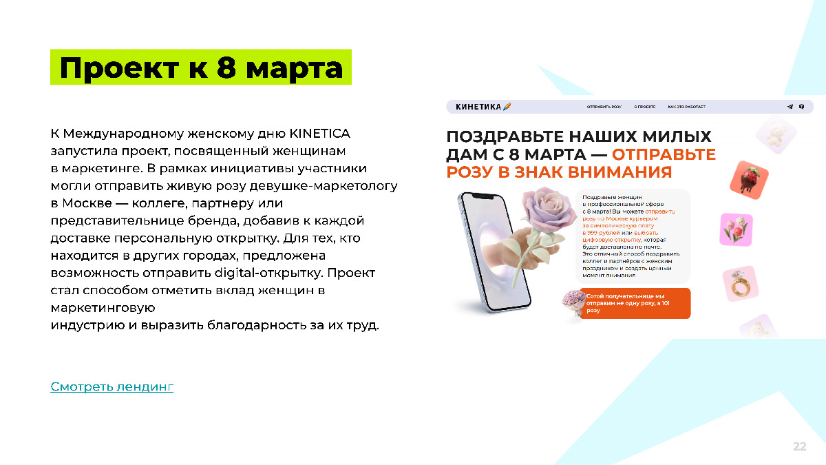 К Международному женскому дню KINETICA запустила проект, посвященный женщинам в маркетинге. В рамках инициативы участники могли отправить живую розу девушке-маркетологу в Москве — коллеге, партнеру или представительнице бренда, добавив к каждой доставке персональную открытку. Для тех, кто находится в других городах, предложена возможность отправить digital-открытку. Проект стал способом отметить вклад женщин в маркетинговую индустрию и выразить благодарность за их труд.