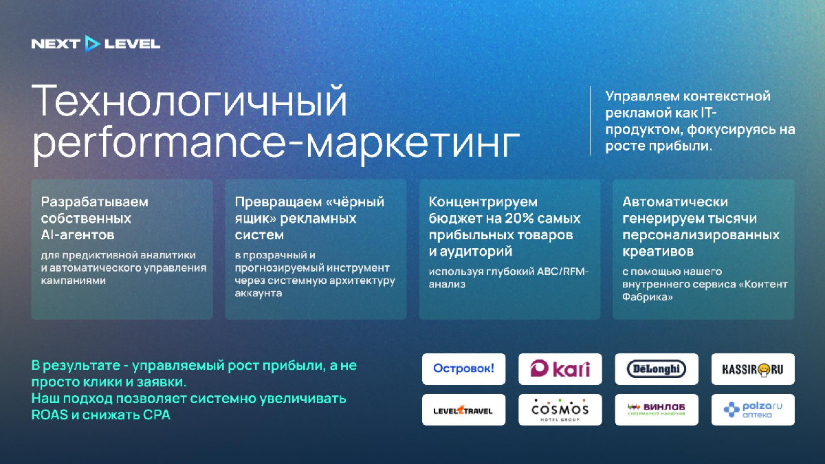 NEXT LEVEL agency— performance-агентство, построенное вокруг собственной R&D-инфраструктуры. Наш основной фокус — управление контекстной рекламой как IT-продуктом: мы ушли от ручного управления ставками в сторону предиктивной аналитики, глубокой архитектуры аккаунтов и AI-автоматизации.
