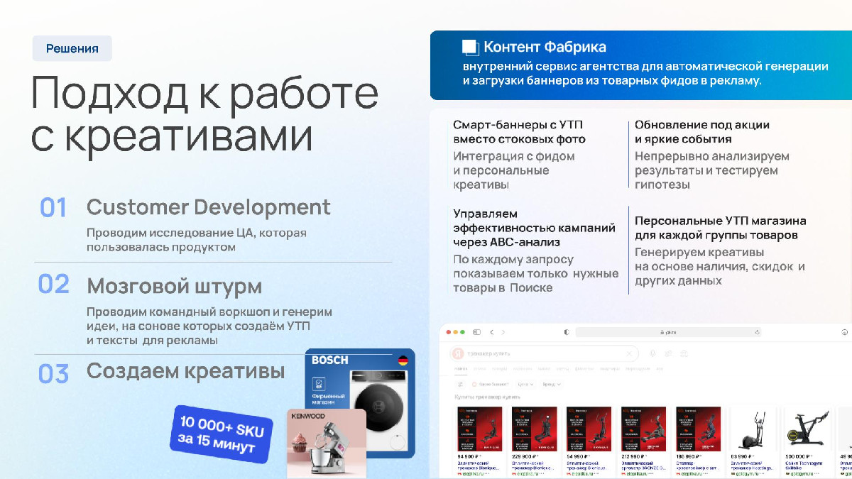 - «Контент Фабрика» (Масштабирование креативов): Внутренняя разработка (резидент «Сколково») решает проблему «баннерной слепоты» при работе с большими товарными каталогами, автоматизируя создание брендированных смарт-баннеров из фидов на объемах более 10 000 SKU. В 2025-2026 гг. мы сделали эту технологию доступной для всего рынка, интегрировав наш сервис в маркетплейс eLama. Теперь автоматизированная генерация качественных креативов доступна не только Enterprise-сегменту, но и малым агентствам и бизнесу, самостоятельно запускающему рекламу.