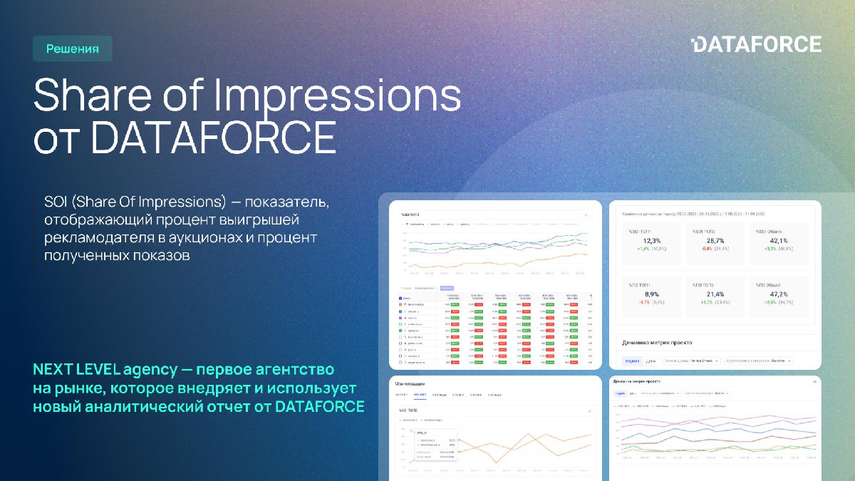 - Аналитика нового уровня: Одними из первых на рынке перевели работу на стандарт DATAFORCE (интеграция решения SEOWORK) для работы с показателем Share of Impressions (SOI). Это дает клиентам прозрачный контроль доли выкупаемого трафика в аукционах.