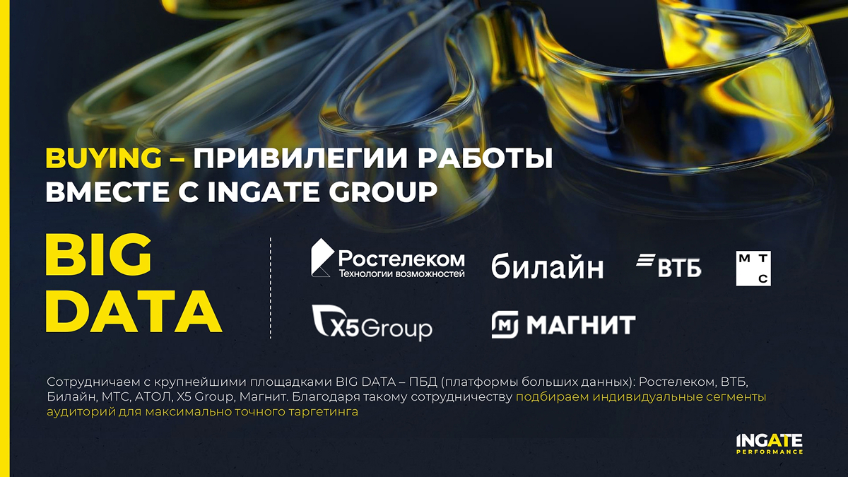 Мы сотрудничаем с крупнейшими платформами больших данных: Ростелеком, ВТБ, Билайн, МТС, АТОЛ, X5 Group, Магнит. Это даёт нам доступ к индивидуальным сегментам аудиторий для точного таргетинга – и позволяет измерять то, что другие измерить не могут.