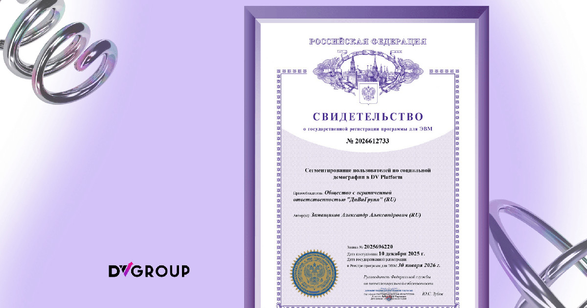 • DV Platform — собственная CDP (Customer Data Platform), которая собирает и анализирует данные онлайн‑транзакций и MAID. В системе более 50 млн уникальных пользователей и более 250 таксономий аудиторных сегментов. Платформа интегрирована с партнёрами по данным (ПБД, Атол, Платформа ОФД и др.), имеет патенты на предиктивные модели и зарегистрирована в реестре российского ПО.