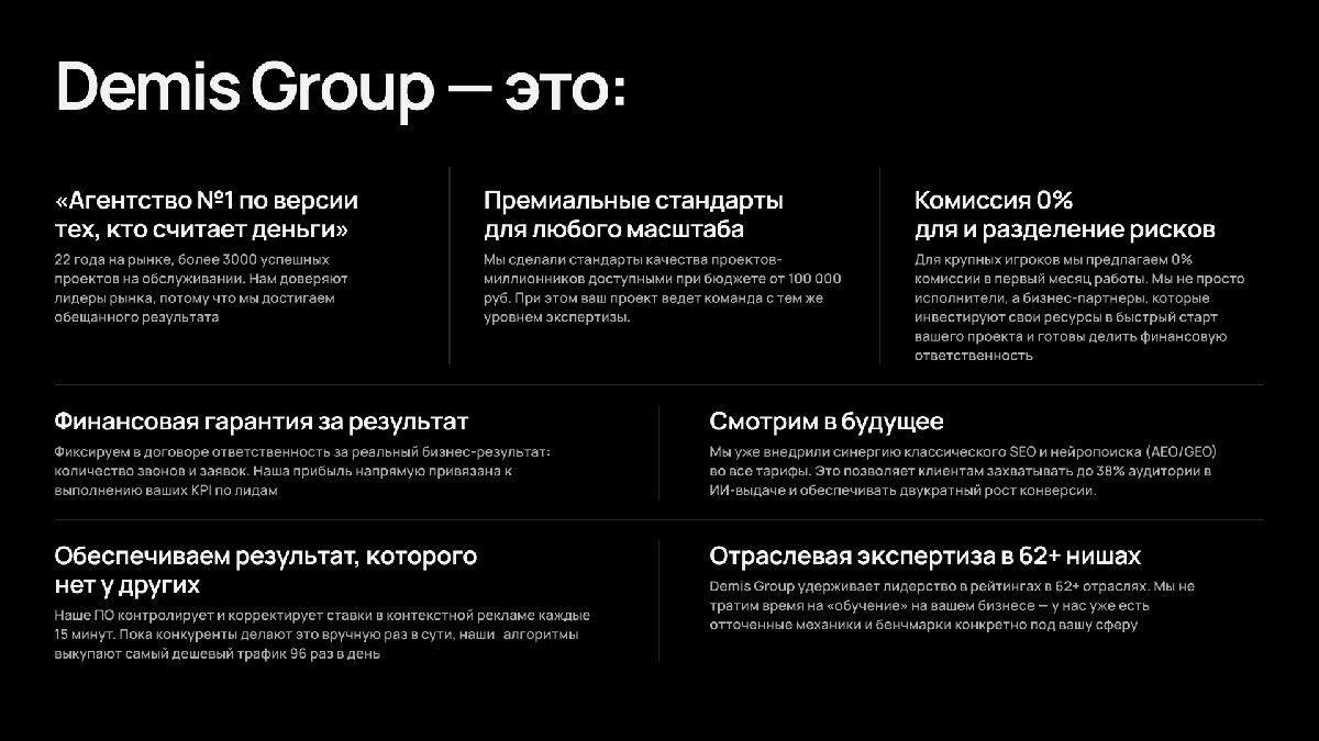 Demis Group управляет спросом в точке его возникновения — в поиске. Наша ключевая экспертиза сегодня — объединение классического SEO и нейропоиска (AEO/GEO) в единую систему присутствия бренда.