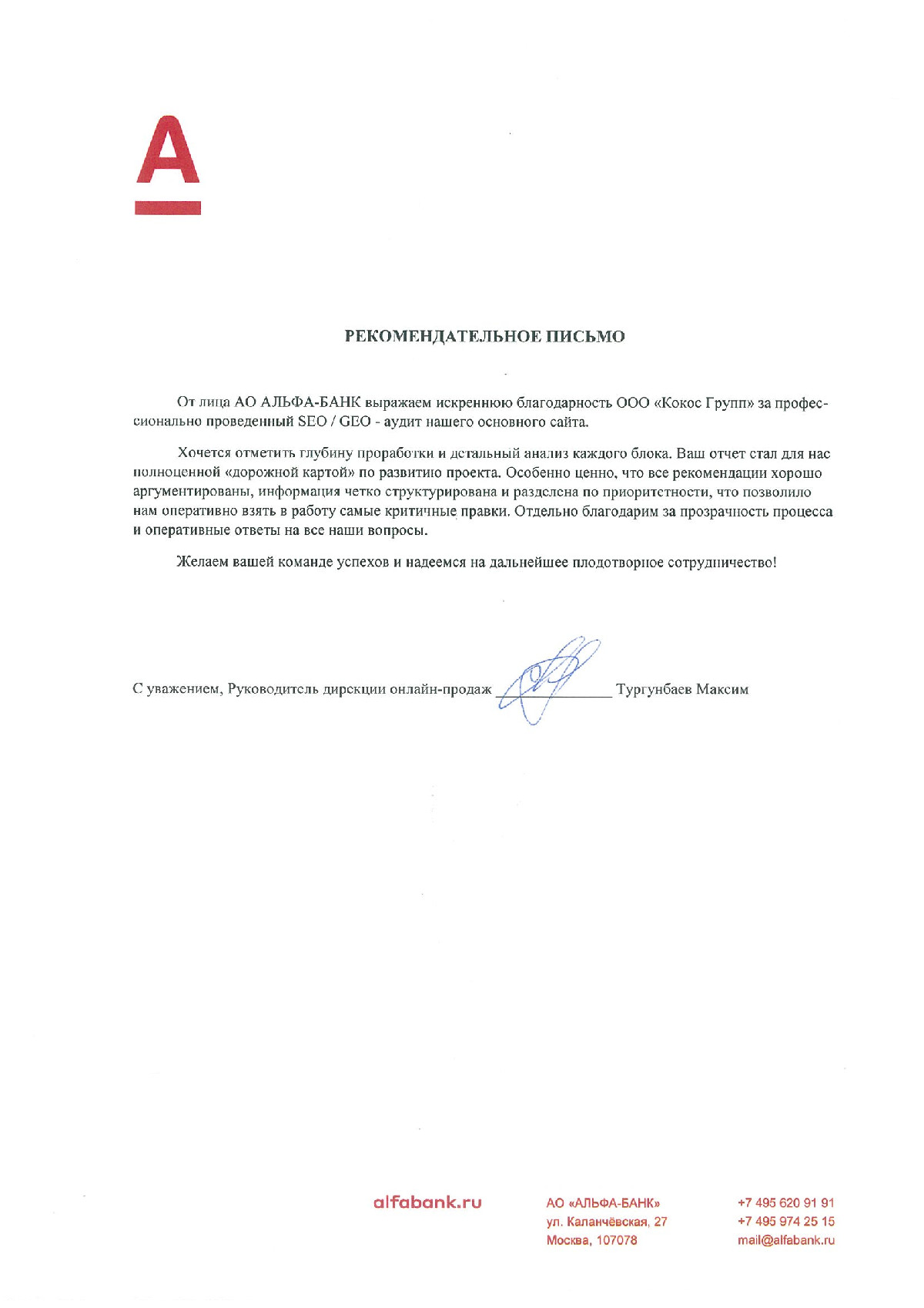 Благодарственное письмо от Альфа-банка за GEO-аудит