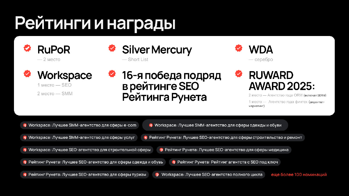 - 1 место в отраслевой экспертизе Финтеха и 2 место в номинации ORM (SERM) на Ruward Award 2025