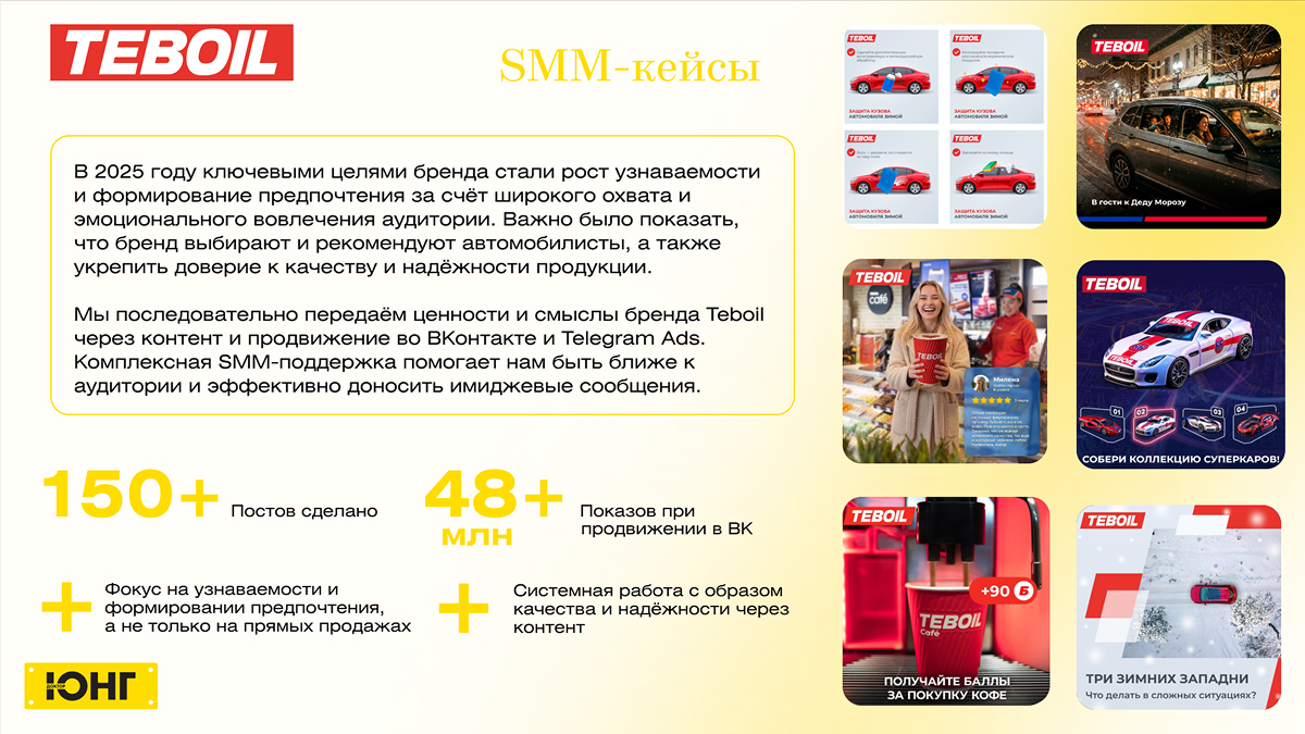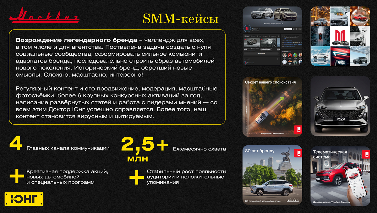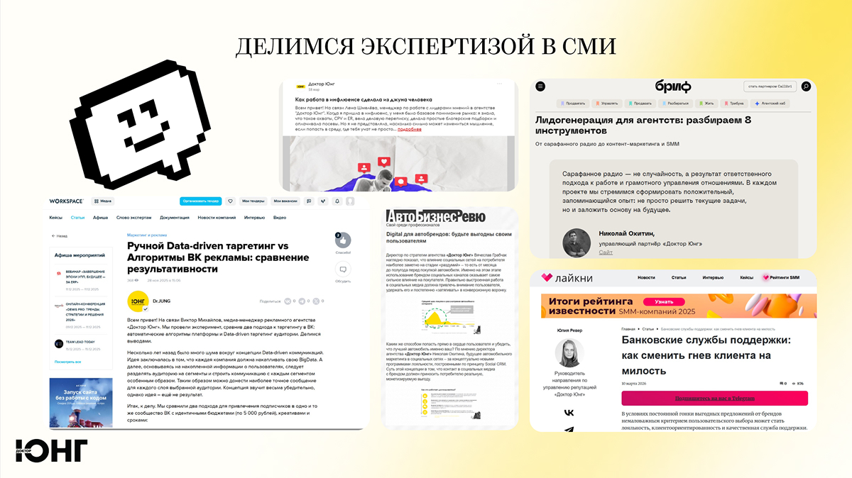 Кроме того, эксперты агентства «Доктор Юнг» активно делятся своим опытом и экспертизой в медиапространстве, выступая авторами статей, давая экспертные комментарии и публикуя аналитические обзоры и исследования рынка (Лайкни, Workspace Media, БРИФ, Sostav и т д.). В блоге агентства они раскрывают профессиональные инсайты, делятся практическими кейсами и разбирают актуальные тренды, помогая аудитории лучше ориентироваться в отрасли и принимать обоснованные решения.