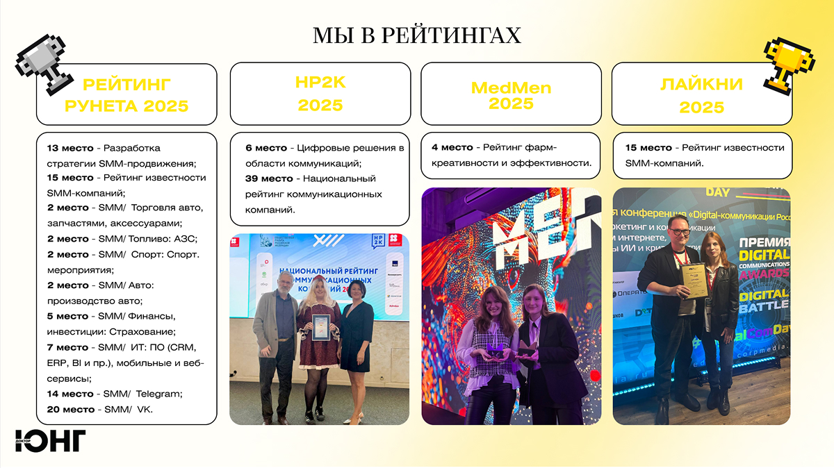 Мы развиваем SMM как систему, а не набор инструментов: интегрируем ИИ в процессы не ради тренда, а как источник новых подходов, эффективности и масштабируемости решений. Такой подход позволяет нам обеспечивать стабильные бизнес-результаты для клиентов и демонстрировать устойчивый рост собственных показателей. Признание в индустриальных рейтингах, награды и долгосрочные партнёрства с клиентами подтверждают, что выбранная стратегия работает.