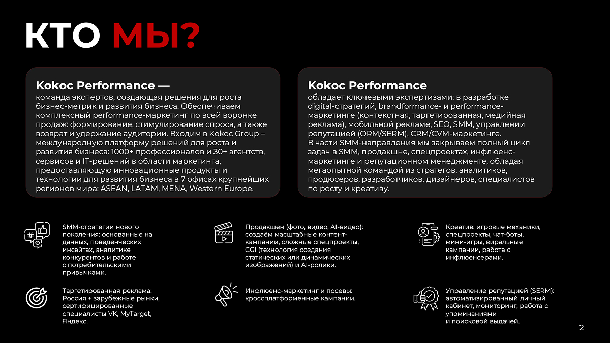 Kokoc Performance обладает ключевыми экспертизами: в разработке digital-стратегий, brandformance- и performance-маркетинге (контекстная, таргетированная, медийная реклама), мобильной рекламе, SEO, SMM, управлении репутацией (ORM/SERM), CRM/CVM-маркетинге. В части SMM-направления мы закрываем полный цикл задач в SMM, продакшне, спецпроектах, инфлюенс-маркетинге и репутационном менеджменте, обладая мегаопытной командой из стратегов, аналитиков, продюсеров, разработчиков, дизайнеров, специалистов по росту и креативу.