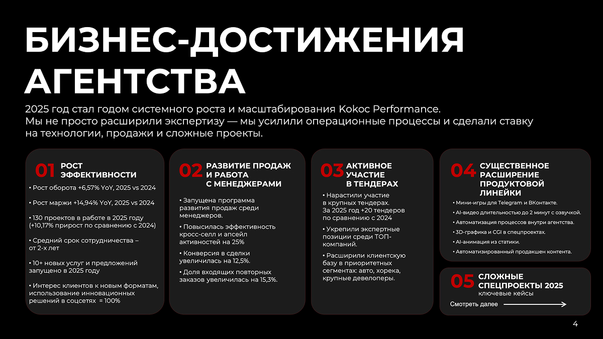 2025 год стал годом системного роста и масштабирования Kokoc Performance. Мы не просто расширили экспертизу — мы усилили операционные процессы и сделали ставку на технологии, продажи и сложные проекты.