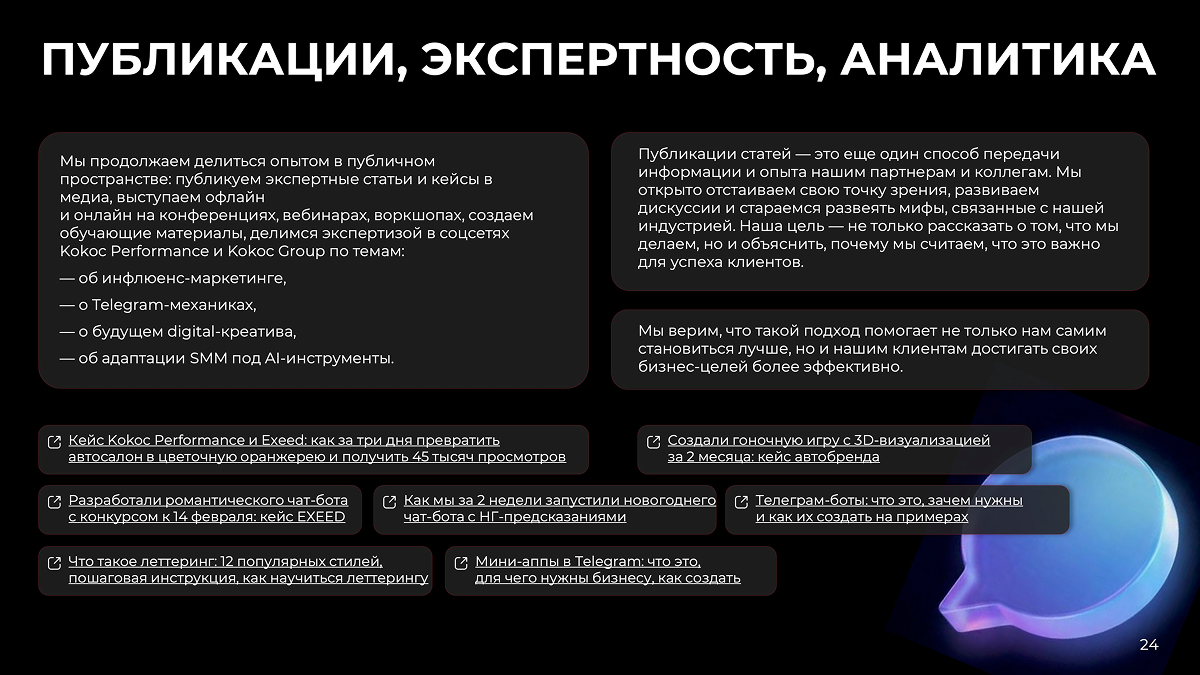 Мы продолжаем делиться опытом в публичном пространстве: публикуем экспертные статьи и кейсы в медиа, выступаем офлайн и онлайн на конференциях, вебинарах, воркшопах, создаем обучающие материалы, делимся экспертизой в соцсетях Kokoc Performance и Kokoc Group по темам: