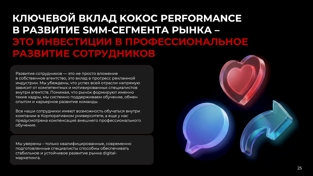 Развитие сотрудников — это не просто вложение в собственное агентство, это вклад в прогресс рекламной индустрии. Мы убеждены, что успех всей отрасли напрямую зависит от компетентных и мотивированных специалистов внутри агентств. Понимая, что рынок формируют именно такие кадры, мы системно поддерживаем обучение, обмен опытом и карьерное развитие команды. Все наши сотрудники имеют возможность обучаться внутри компании в Корпоративном университете, а еще у нас предусмотрена компенсация внешнего профессионального обучения.