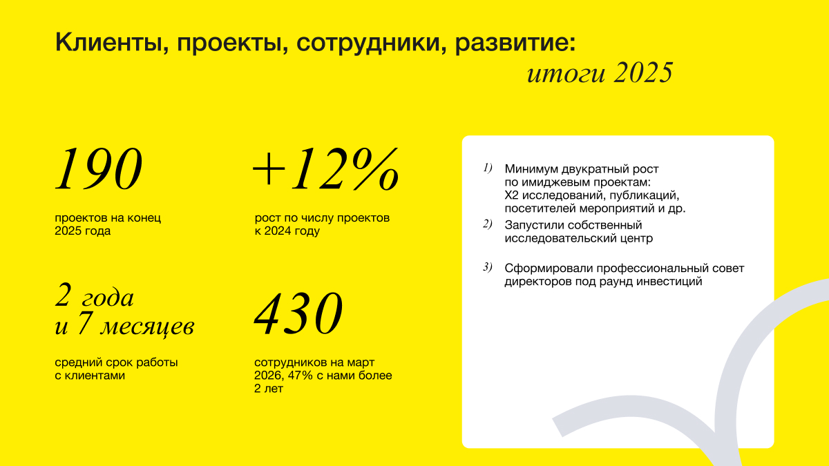 В 2025 году мы выросли по количеству клиентских проектов, создали исследовательский центр, усилили собственные маркетинговые проекты и запустили новые, завоевали ряд престижных наград. Выручка компании превысила 750 миллионов рублей.