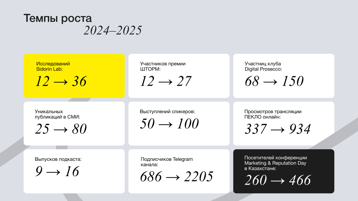 К 15-летнему юбилею мы сняли фильм-ретроспективу «Намедни Sidorin Lab» в стилистике культовой программы Леонида Парфенова. Это срез эпохи российского диджитал-рынка с 2010 по 2025 год. Через личные истории cотрудников показали, как менялись технологии, медиапотребление и сама индустрия репутации на фоне больших исторических событий (от Олимпиады в Сочи до ухода Дурова из ВК) и как менялись и росли мы. Фильм доступен для просмотра ниже и по ссылке.
