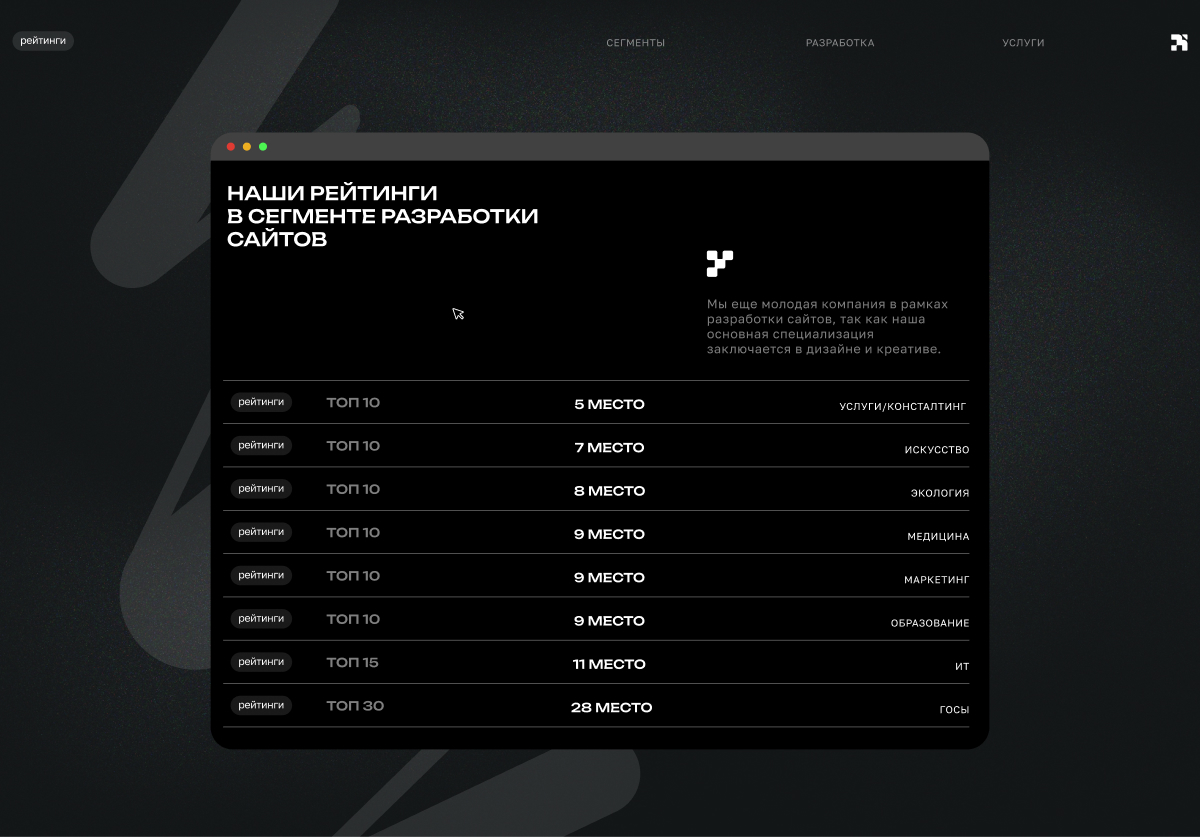 Мы по-прежнему остаемся молодой компанией именно в сегменте веб-разработки: исторически наша ключевая специализация — дизайн и креатив. Поэтому в общих отраслевых рейтингах нам пока сложно конкурировать с крупными игроками с большим производственным масштабом. Понимая специфику рынка, мы сделали ставку на те ниши, где наш подход работает особенно сильно, и получили хорошие результаты: