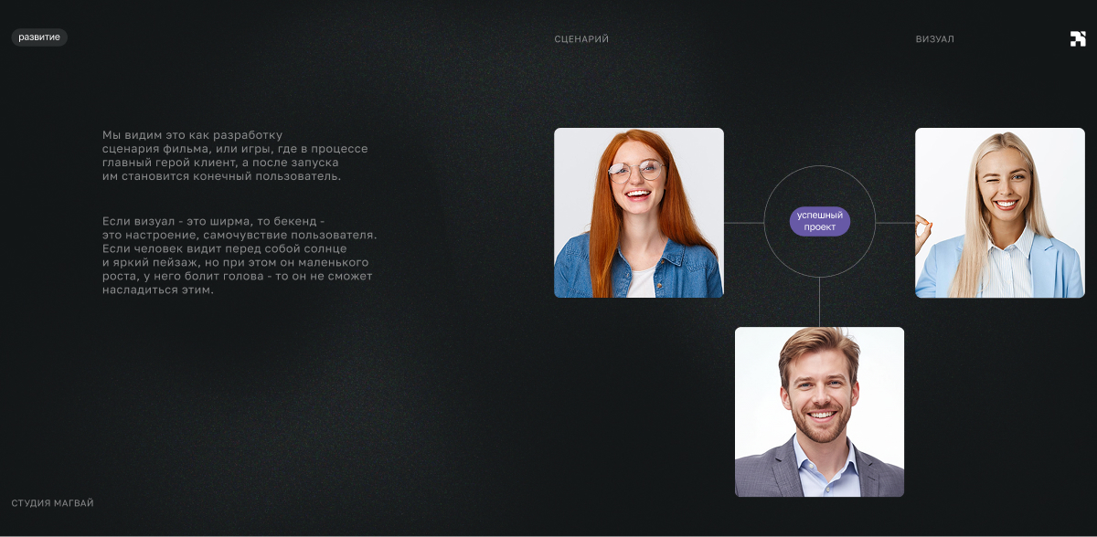 Основа нашего подхода — в том, что мы не воспринимаем разработку как механическую связку «сначала дизайн, потом программирование». Мы выстроили собственную методику — «дизайн для роста». В ее основе лежит идея, что цифровой продукт должен работать как хорошо поставленный фильм: со сценарием, драматургией, ритмом, персонажами и эмоцией.
