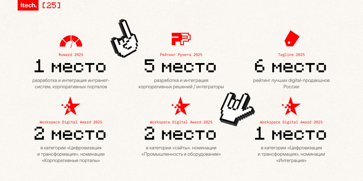 В 2025 году проекты ITECH получили три награды Workspace Digital Award, включая золото за корпоративное PWA-приложение для ТС ПОБЕДА и серебро за решения для компании Северсталь и СИМЭСК. В RUWARD AWARD 2025 заняли 1 место в номинации «Интеграция CRM» за проекты по автоматизации процессов DEPO, Лан АТМСервис, Северсталь—ЦЕС и модернизации нашей собственной CRM-системы, а также 2 место в номинации «Агентство года».