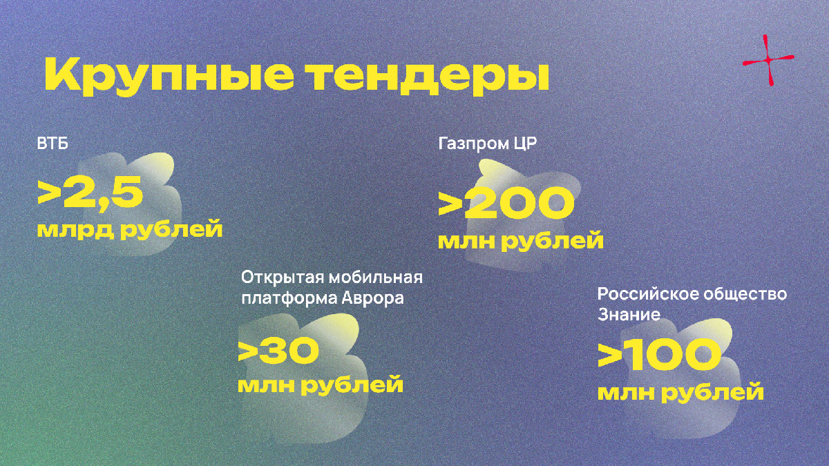 - Работа с крупными заказчиками: масштабные проекты для Газпром ЦР (>200 млн руб.), ОС «Аврора» (>30 млн руб.) и Российского общества «Знание» (>100 млн руб.).