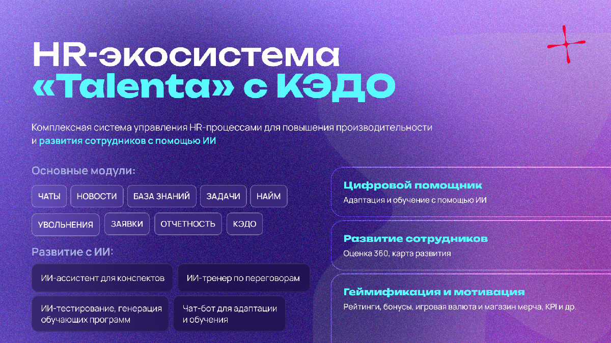 - Запустили флагманский продукт компании — HR-экосистему Talenta с КЭДО и ИИ обучением и адаптацией сотрудников.
