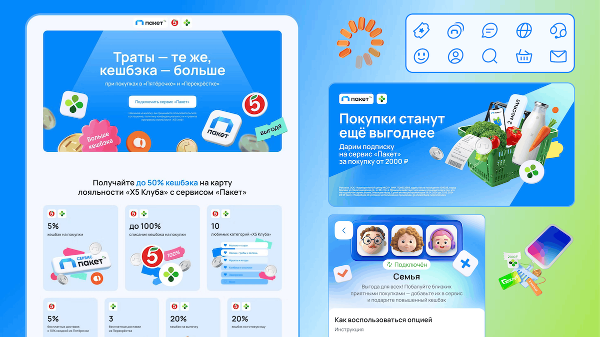 - Сервис «Пакет» от Х5 клуба. Работаем с 2024 года, оказываем системную дизайн-поддержку, запустили 15+ проектов разного масштаба для поддержки онлайн- и офлайн-коммуникаций бренда. Получили два «серебра» на Tagline Awards за иллюстрации и генерации для бренда.