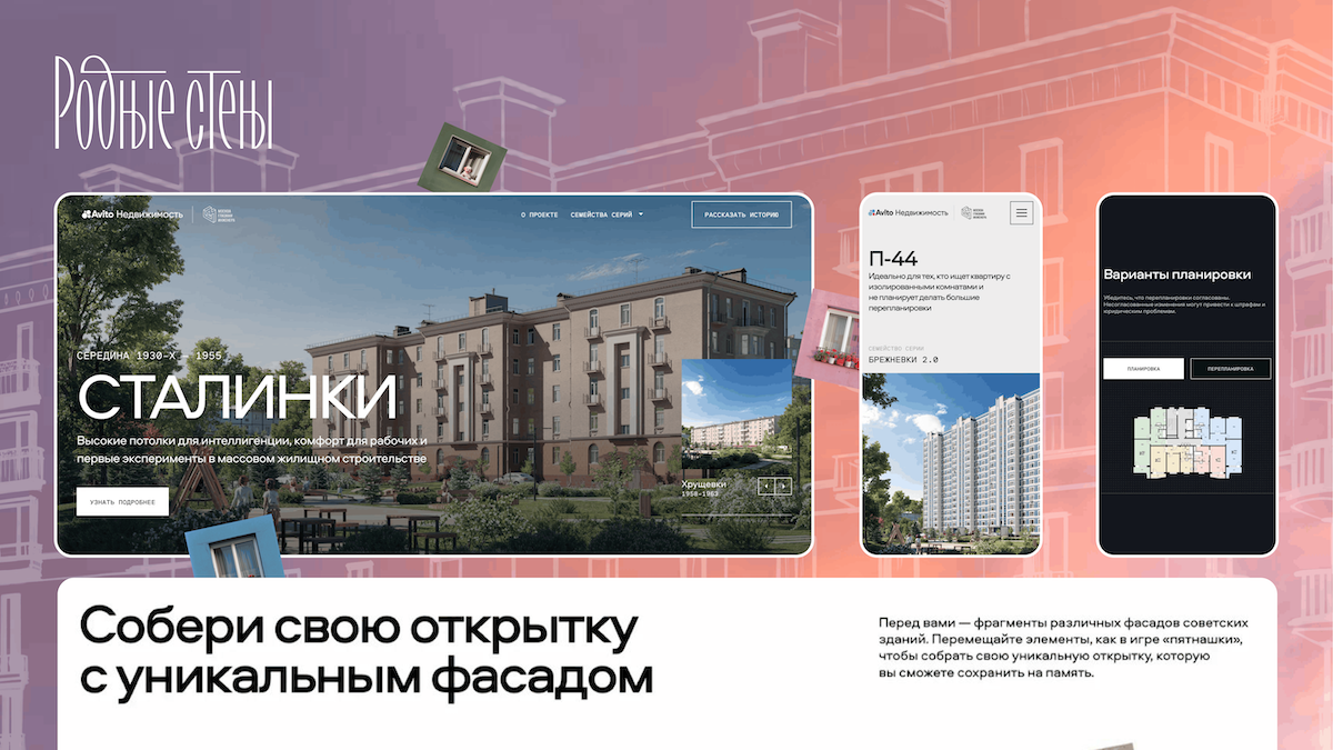 - Весной за четыре недели создали лендинг «Родные стены» для спецпроекта Авито Недвижимости и «Москвы глазами инженера». Рассказали о домах типовой затройки с уважением и исторической точностью, а еще вовлекли пользователей во взаимодействие с сайтом: 1800+ человек создали уникальные открытки с окошками. Проект получил «золото» на Tagline Awards в номинации «Лучший сайт для недвижимости»