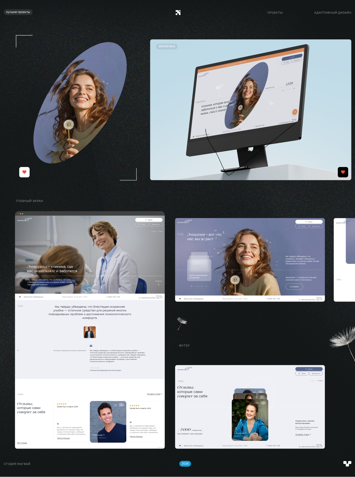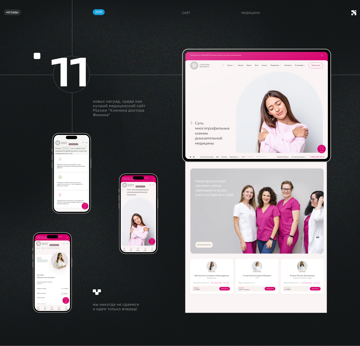 Главной из них считаем 1 место в номинации «Лучший медицинский сайт России» за проект «Клиника доктора Фомина» — работу, в которой нам удалось соединить визуальную выразительность, доверие, точность и высокую функциональность.