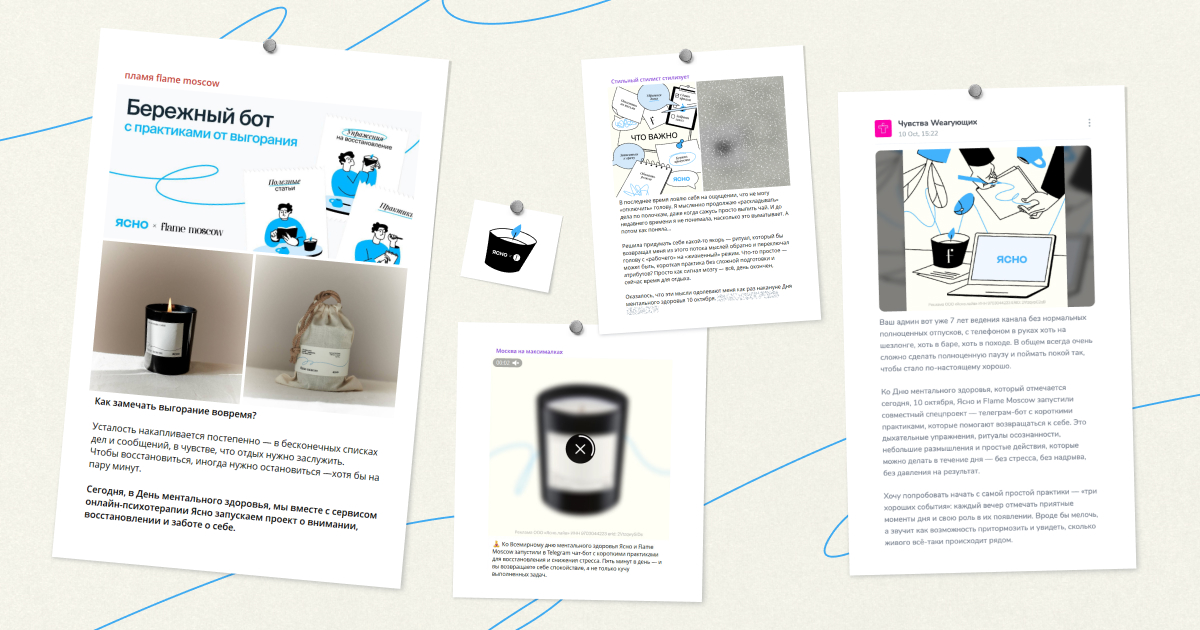 Ко Дню ментального здоровья онлайн-сервис психотерапии «Ясно» и парфюмерная студия Flame Moscow создали лимитированную свечу и чат-бот в Telegram, объединённые общей идеей: вернуть себе внимание и внутреннее равновесие.