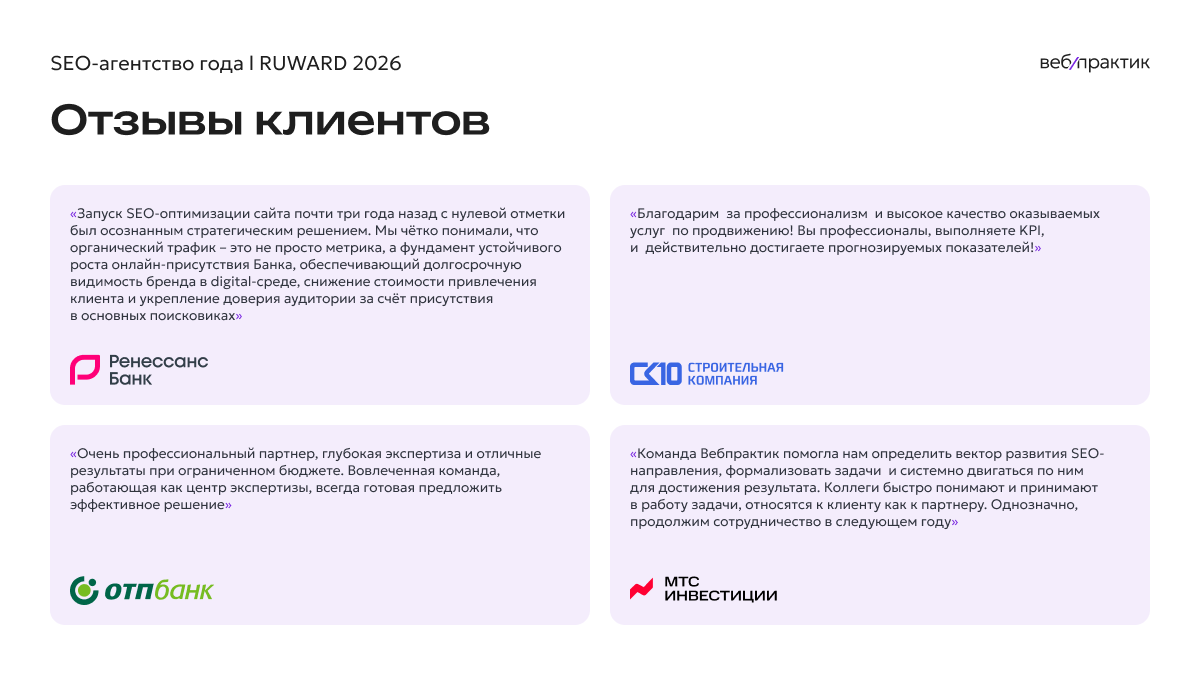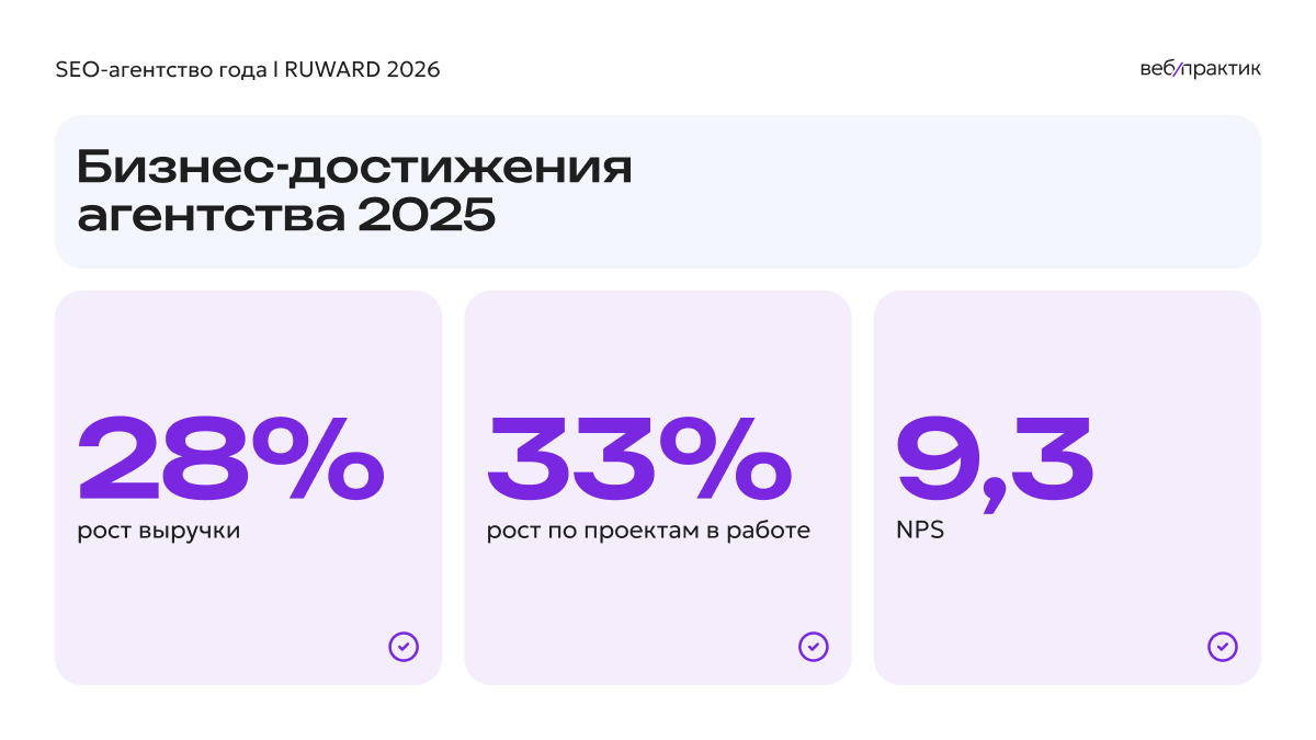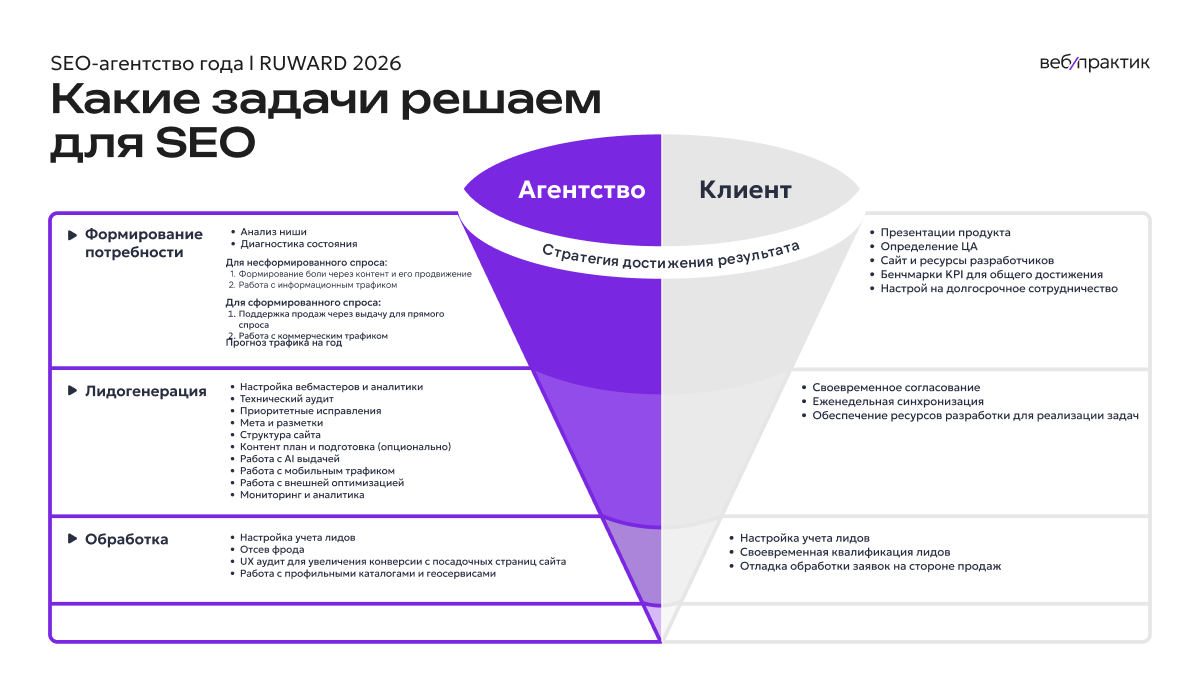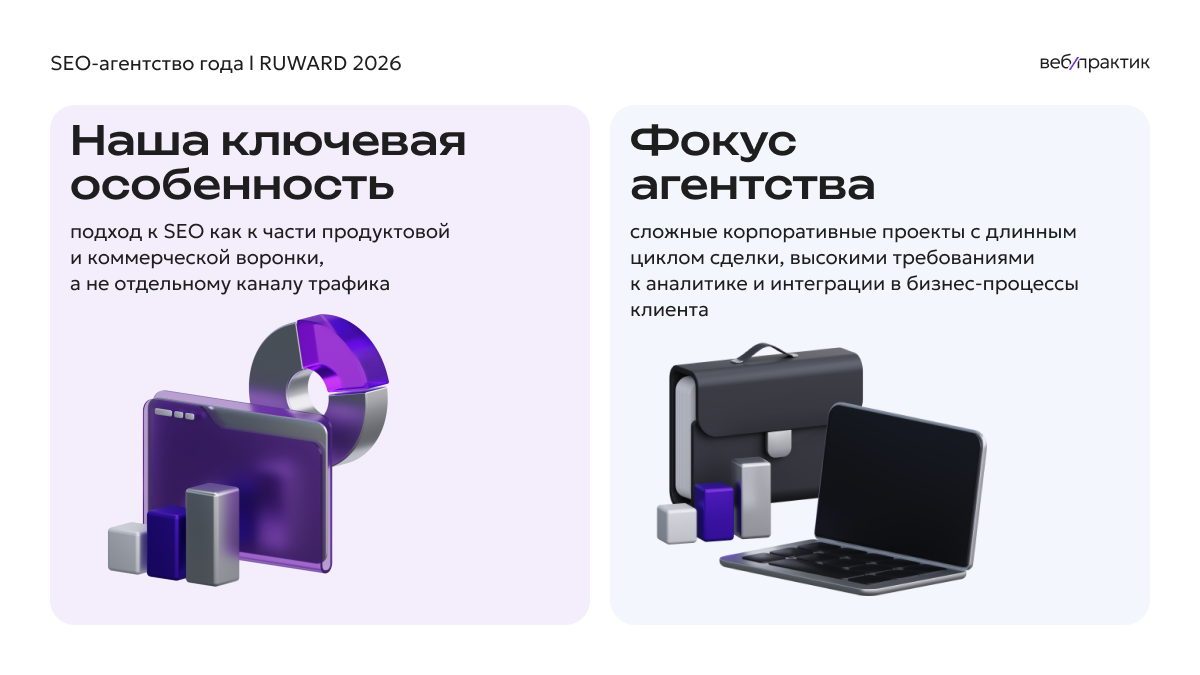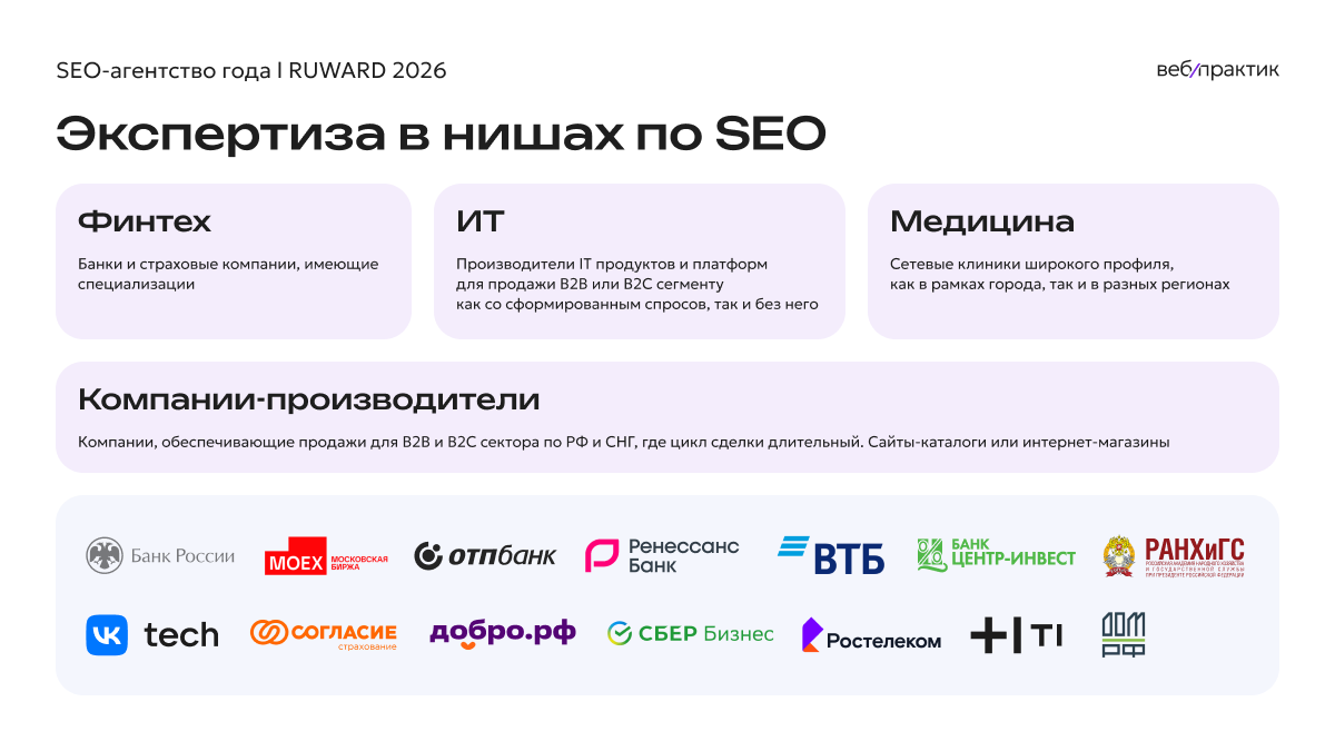 В 2025 году «Вебпрактик» усилил позиции как партнер для корпораций, где SEO напрямую влияет на выручку и продуктовые KPI.