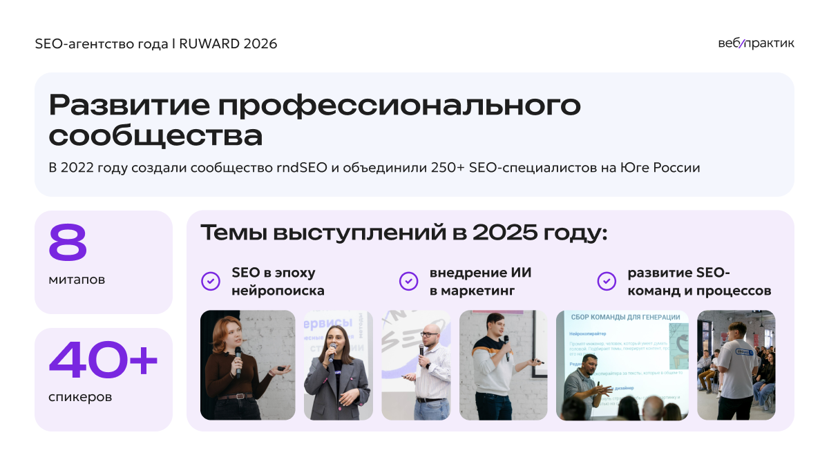 - развиваем SEO-комьюнити и постоянно апгрейдим свою команду.