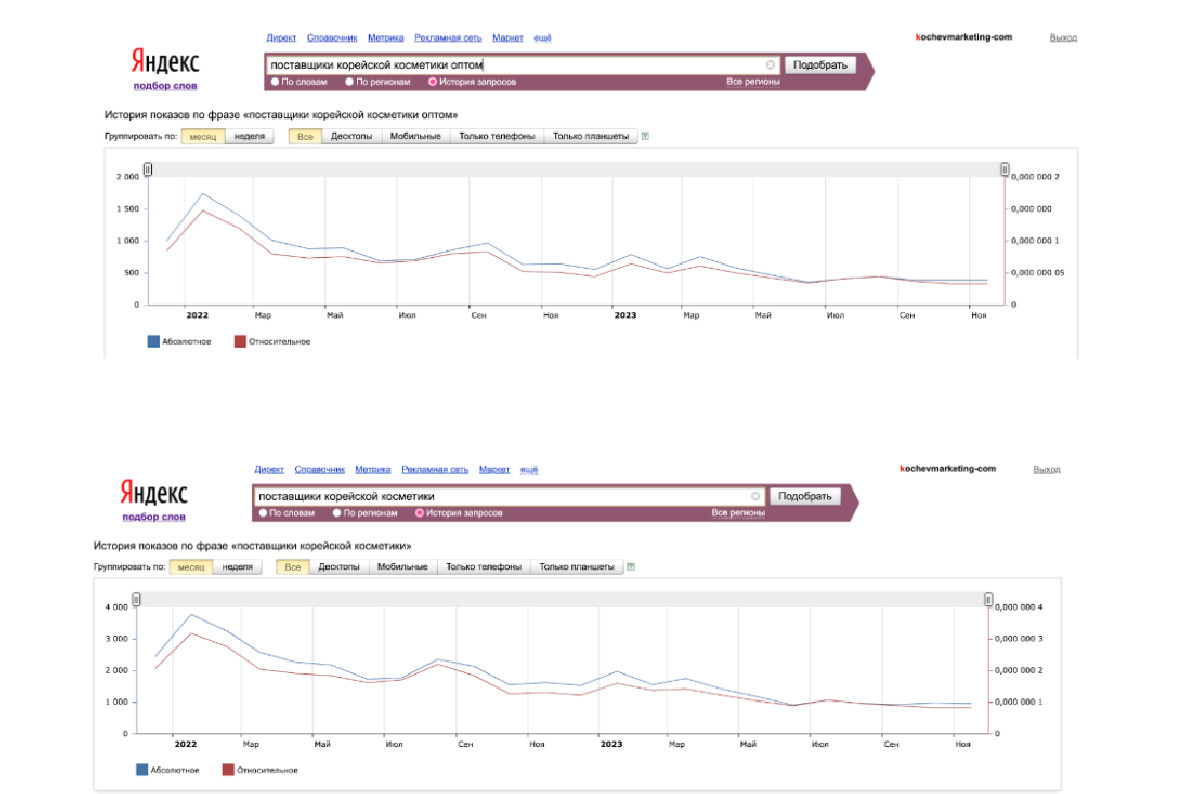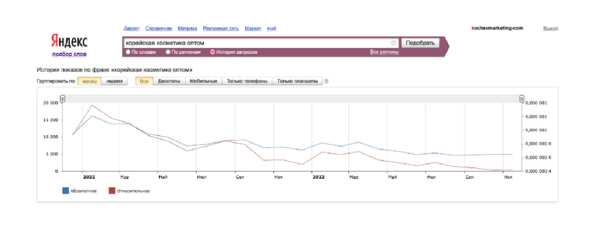 В условиях падения спроса в нише сделать это было непросто. По данным Wordstat за последние несколько лет наблюдалась отрицательная тенденция по запросам «поставщики корейской косметики оптом», «поставщики корейской косметики», «корейская косметика оптом» и т.д.