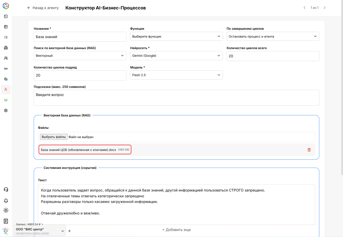 На платформе VisGPT нами был сформирован AI-агент на базе нейросети Gemini от Google с системной инструкцией по обработке запросов и с загруженной в него базой знаний компании, предварительно обработанной и векторизированной на предыдущем шаге.