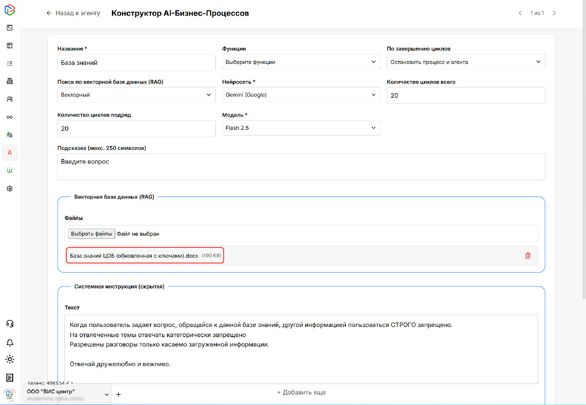 На платформе VisGPT нами был сформирован AI-агент на базе нейросети Gemini от Google с системной инструкцией по обработке запросов и с загруженной в него базой знаний компании, предварительно обработанной и векторизированной на предыдущем шаге.