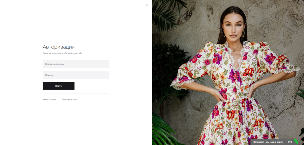 - Интегрировали Jivo-чат. Для премиального бренда личное общение и мгновенные ответы на вопросы критически важны. Чат повышает доверие и конверсию, позволяя консультанту помочь с выбором размера, ткани или оформлением заказа прямо на сайте.