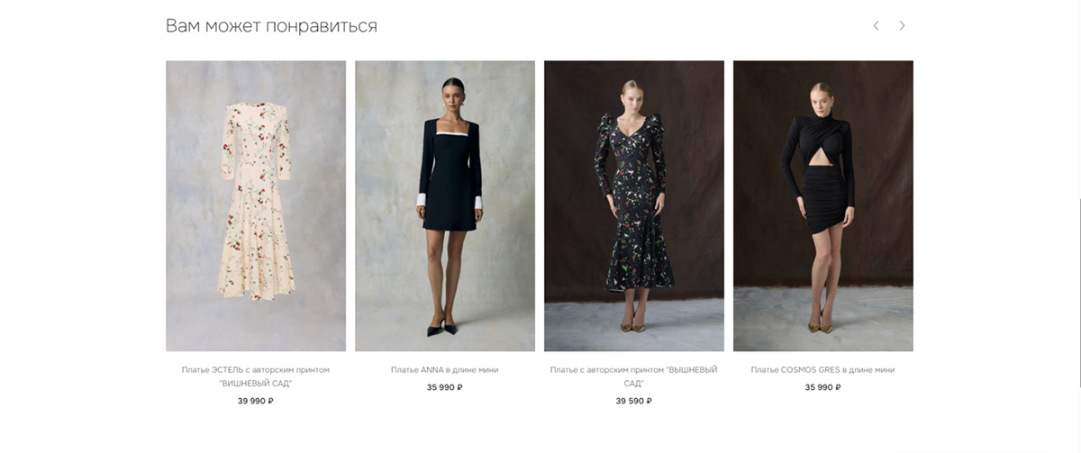 - Реализовали блок «Вам также может понравиться». Зачем: Это ключевой инструмент для повышения среднего чека и клиентской вовлеченности. Система анализирует выбранные товары и предлагает идеальные дополнения (аксессуары, вещи из той же коллекции или схожей стилистики), превращая единичную покупку в целостный образ.