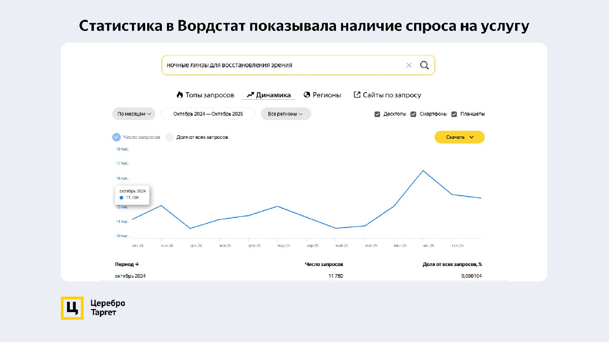Цифры по запросам в Вордстате на старте составляли более 1000 показов: