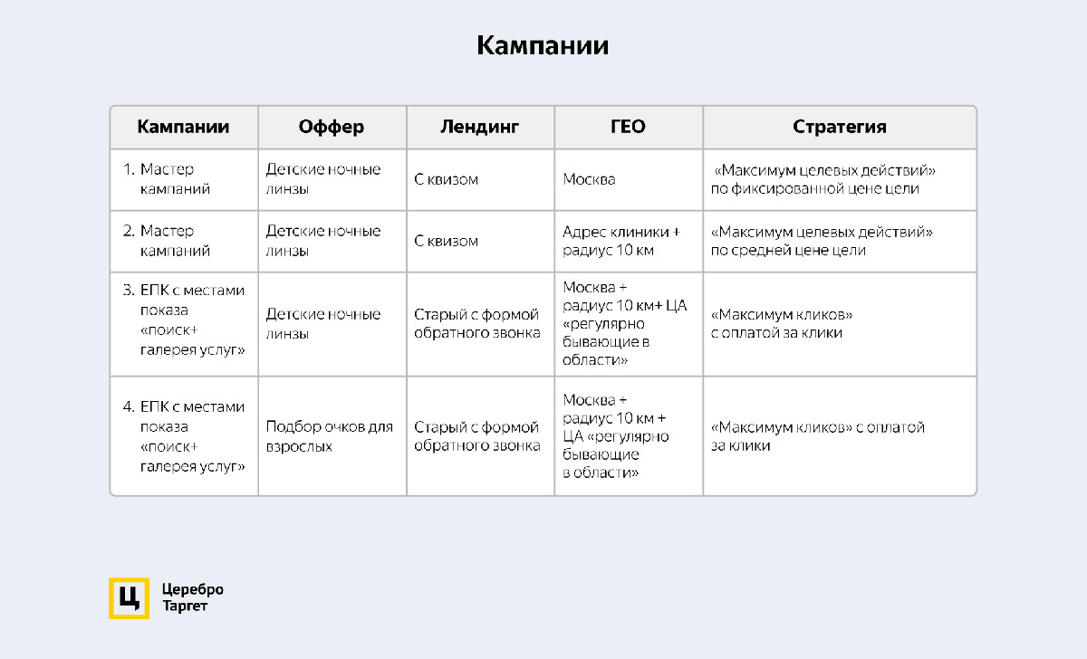 Для сегмента мам настроили 3 кампании с оффером на детские ночные линзы: 2 мастера кампаний, 1 ЕПК с местами показа «поиск+галерея услуг». Отдельно ЕПК с местами показа «поиск+галерея услуг» — для взрослых, интересующихся подбором очков.
