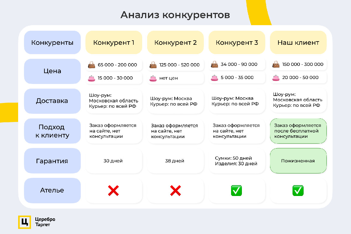 Клиент предоставил список своих конкурентов. Для объективной оценки оценивали их по следующим критериям: стоимость изделий, наличие доставки, подход к клиенту, гарантийный срок и наличие индивидуального пошива.