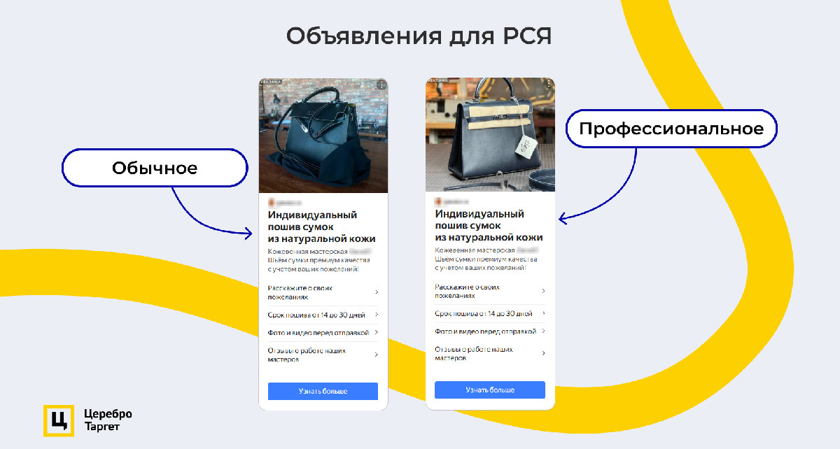 — РСЯ. Креативы отличаются фотографиями. Первое имитирует съемку обычным пользователем, чтобы вызвать больше доверия. Второе — профессиональное, чтобы показать премиальность.