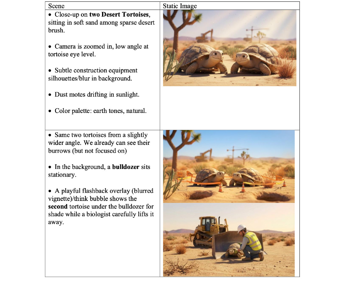 - Проблема с черепахой: Первоначальные генерации изображали пустынную черепаху огромной по сравнению с биологом. Мы скорректировали масштаб, чтобы он соответствовал действительности (взрослые пустынные черепахи Мохаве достигают в длину всего около 30 см). Такое внимание к деталям необходимо для обеспечения единообразия персонажей в ИИ-видео.