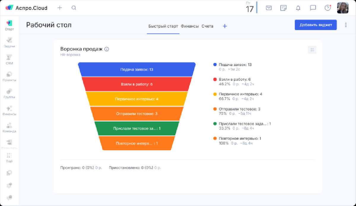 - HR-воронку в CRM с этапами найма и автоматическим созданием карточек кандидатов;