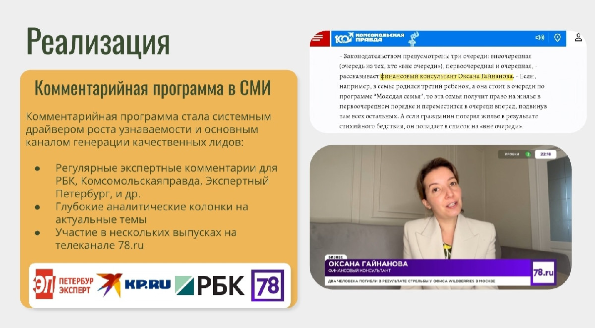 Стратегический выход на телевидение: реализовано целенаправленное продвижение на телевизионные площадки. Ключевым результатом стало участие в нескольких выпусках на телеканале 78.ru. Экспертные комментарии на ТВ, например, по острым социально-финансовым темам (очередь на жилье, программы поддержки), стали мощнейшим социальным доказательством, закрепившим в сознании аудитории статус Оксаны как главного практикующего эксперта, к которому обращаются СМИ за комментариями федерального уровня.