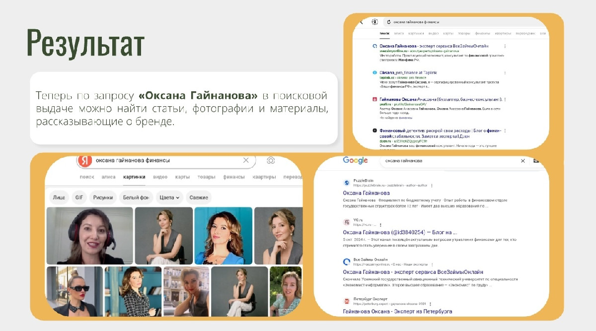 Цифровой след как неоспоримое доказательство экспертизы: по запросу «Оксана Гайнанова» в поисковой выдаче теперь находится множество статей, интервью, профилей на VC.ru, в сервисе «ВсеЗаймыОнлайн», а также ссылки на личный сайт и соцсети. Это создало полноценный и контролируемый цифровой портрет эксперта.