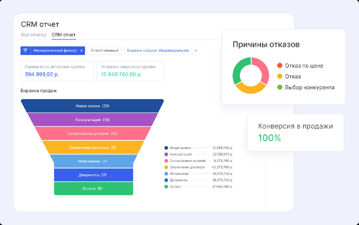 - Воронка продаж — управленческий контроль сделок.