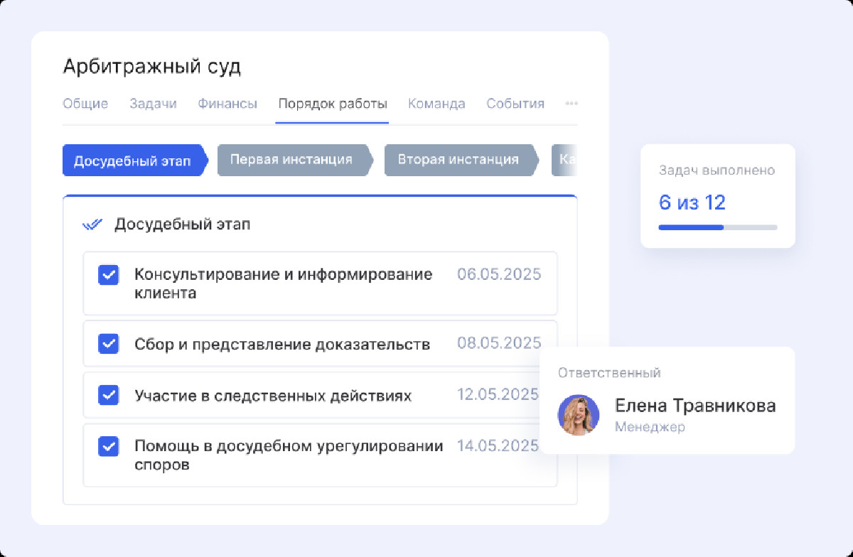 Для типовых дел внедрили шаблоны. Они включают стадии и задачи по процедурам банкротства и другим юридическим процессам.