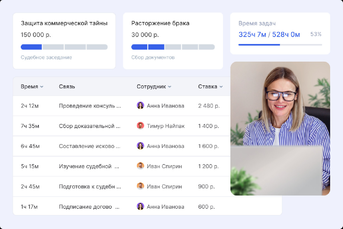 Компания автоматизировала управление проектами, учет времени и финансовые процессы при одновременном ведении до 30 юридических дел.