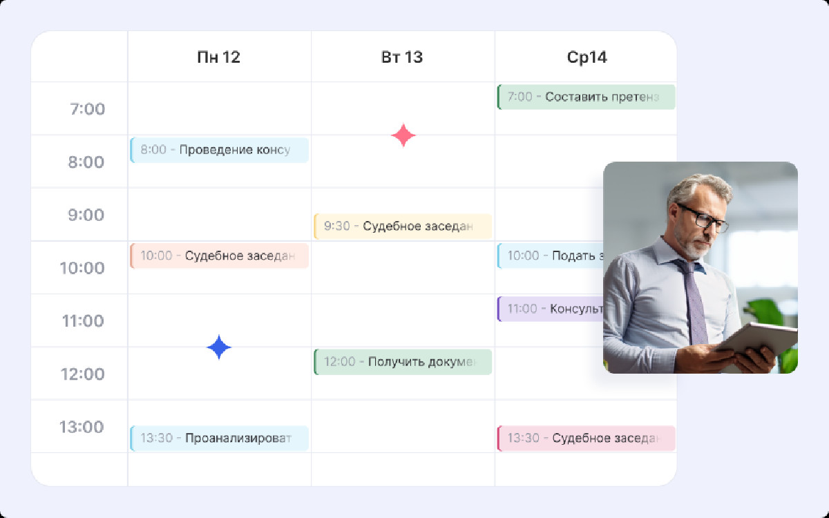 Общий календарь объединил судебные заседания и встречи. Сотрудники видят занятость коллег и координируют графики.