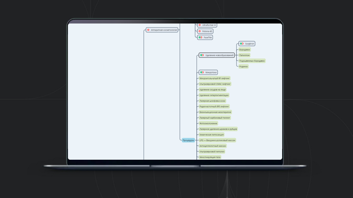 Приоритет – продвигать наиболее маржинальные услуги, преимущественно из аппаратной косметологии, с акцентом на конкретные позиции, а не на категорию в целом.