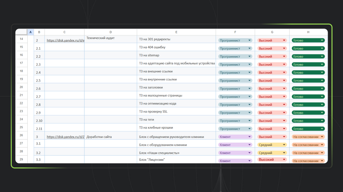 После анализа текущих результатов сайта и проведения аудитов мы зафиксировали ключевые решения по продвижению: