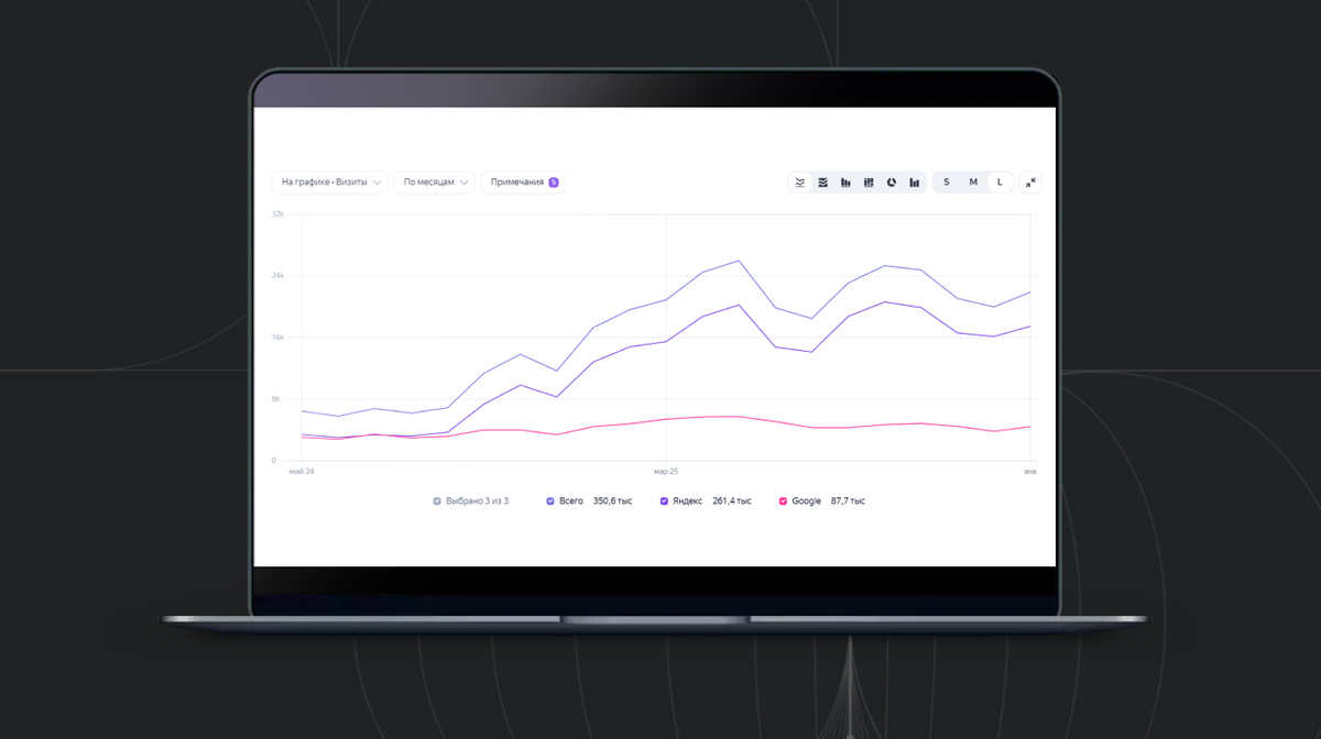 - • Google: май 2024 – 26 запросов в ТОП-10 (2%); январь 2026 – 568 в ТОП-10 (24%), 206 в ТОП-3 (9%).