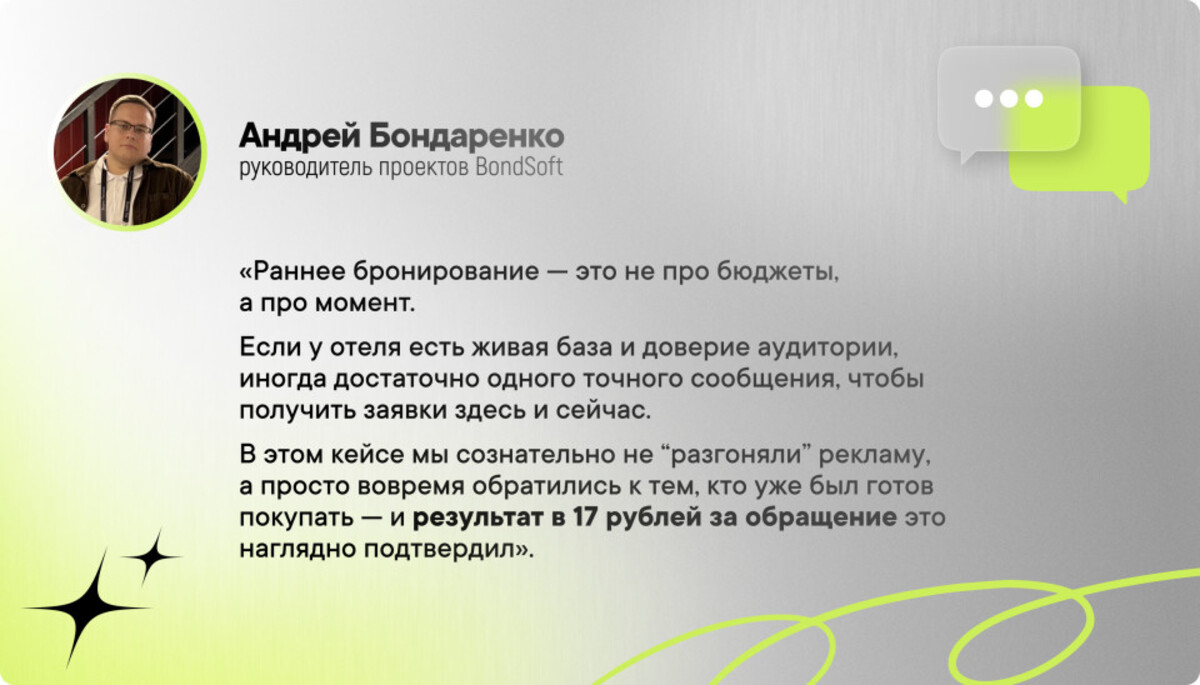 Кейс посвящён запуску раннего бронирования через рассылку во ВКонтакте и демонстрирует, как получить заявки по 17 ₽ при наличии активного сообщества отеля.