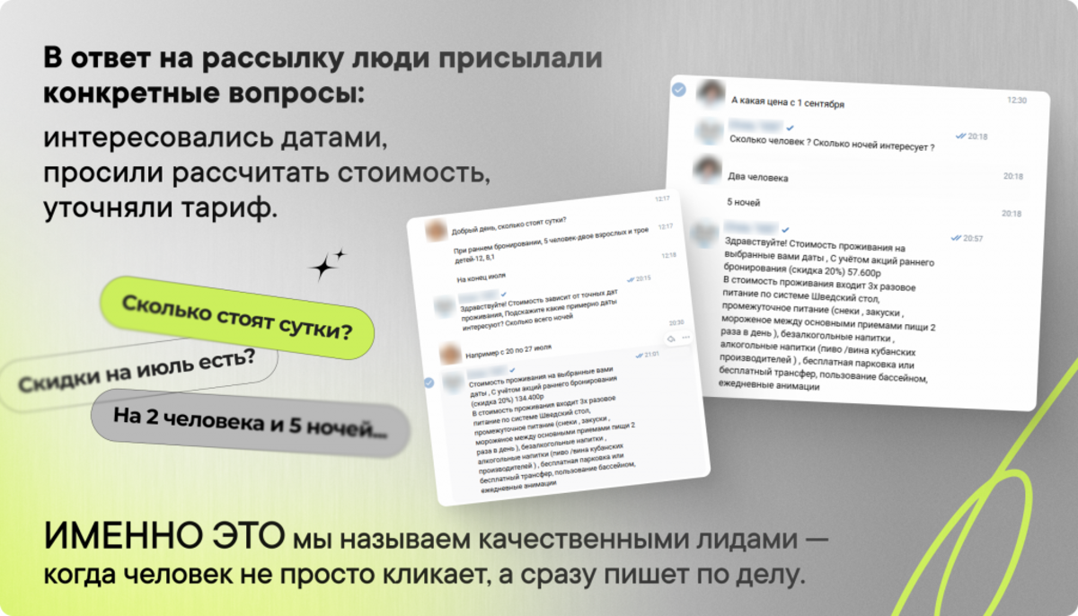 В одном сообщении соединились оффер, доверие и понятный call-to-action. А в каждом диалоге — потенциальная бронь с конкретными датами и составом гостей.